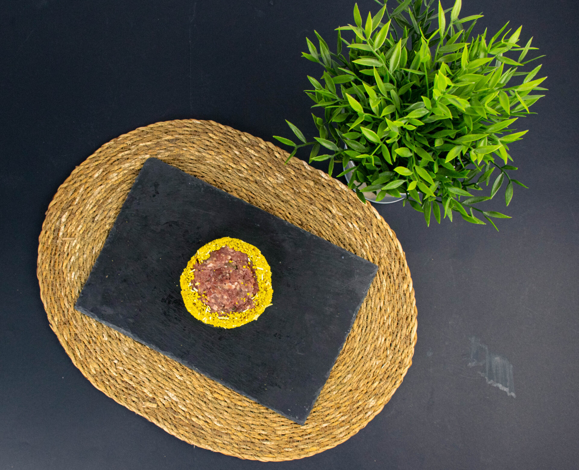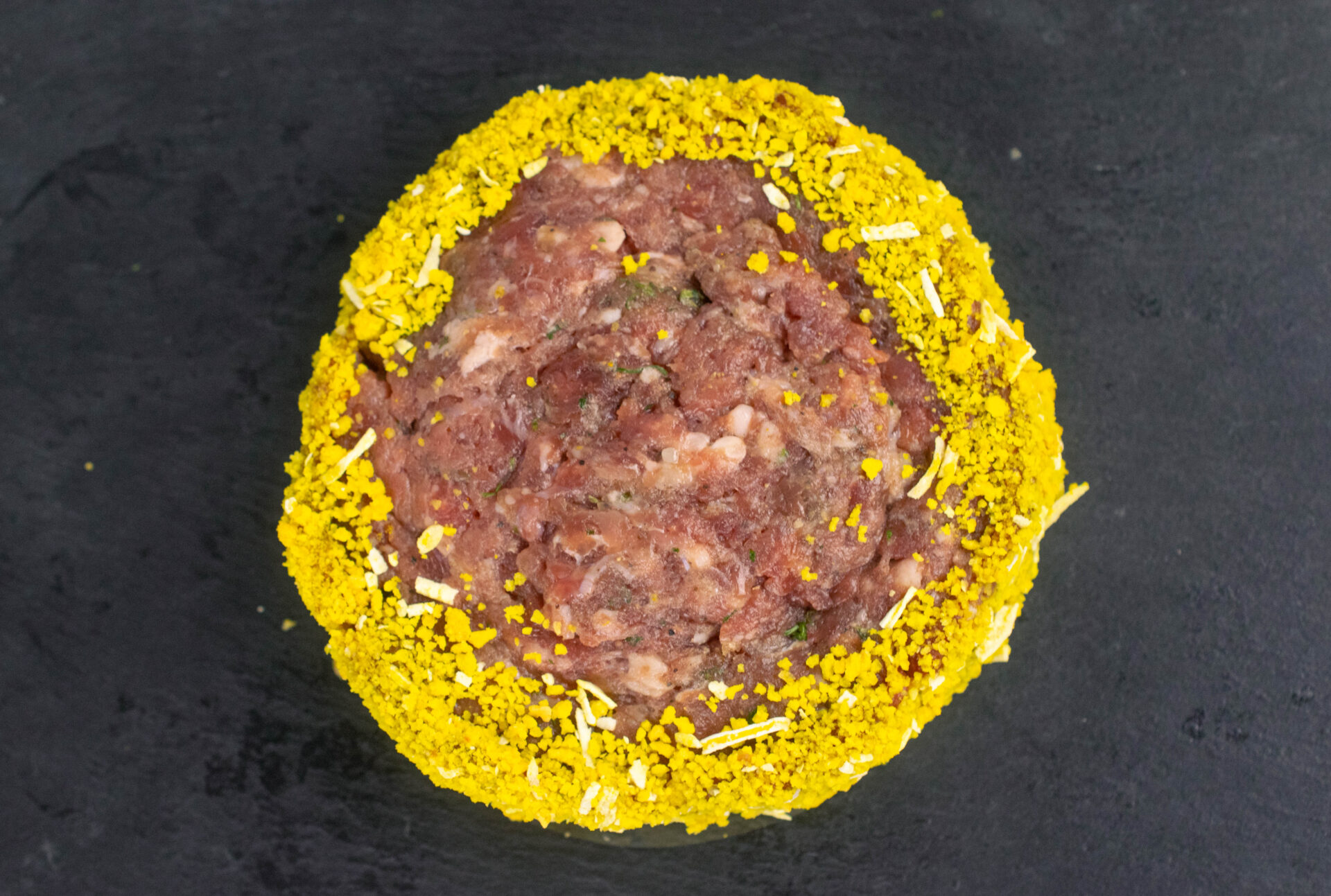 Hecha de carne picada de ternera, salsa de pimienta y maíz tostado.